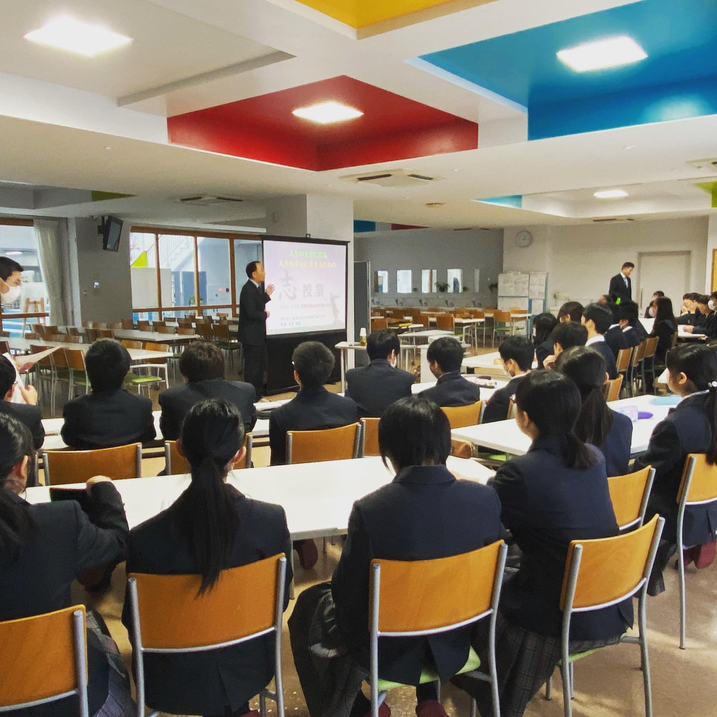 岐阜聖徳学園大学附属中学校の1年生約100名を対象に、1時間の「志授業」を開催いたしました。当日は活動を共にする酒井研治氏と吉野克弘氏もオブザーバーとして参加し、多角的な視点から生徒たちの学びを見守りました。